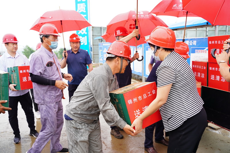7月2日下午,錦州市總工會黨組書記、分管日常工作的副主席劉春榮、副主席孟軍一行來到LXB供水錦州市配套供水工程施工現(xiàn)場看望慰問奮戰(zhàn)在高溫下的一線職工,為工人們帶來了防暑降溫物資和組織的關(guān)懷,集團班子成員陪同慰問。此次市總工會開展的“夏日送清涼”活動為建設(shè)單位帶來關(guān)懷的同時表達了對民生供水工程的重視。