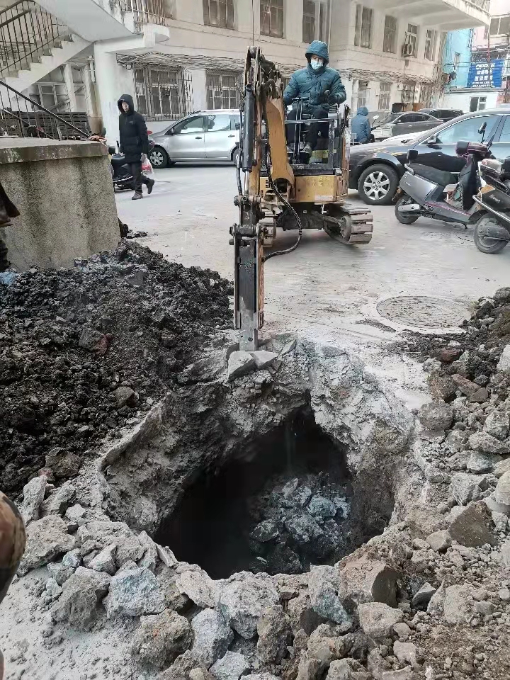 經過3個多小時的篩網式排查,最后在泵房南側一處下水井井壁發(fā)現(xiàn)有細微水流溢出,但根據(jù)圖紙該下水井附近并無供水管線鋪設,維修人員根據(jù)泵房周邊管線分布,決定在泵房二次網管線出口附近選點進行開挖。由于開挖點為水泥路面,墊層硬度及厚度均超出預想,開挖進度十分緩慢。