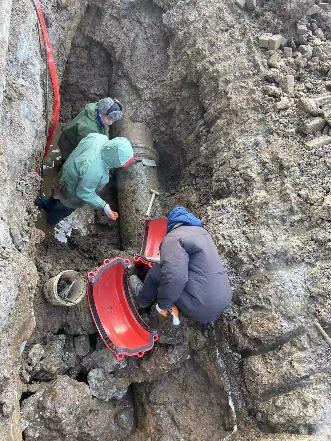 經(jīng)過了近10個小時的挖掘,終于在第二天早上8時將凍土層挖開,找到破損的DN500 三通件承口,搶修人員穿著皮叉進入深 3.5米的作業(yè)坑,于上午10時將漏點堵住并進行回填作業(yè),大家不顧寒冷,歷經(jīng)15小時連續(xù)奮戰(zhàn),于次日12時圓滿完成搶修任務(wù),及時恢復(fù)鐵北地區(qū)安全供水。